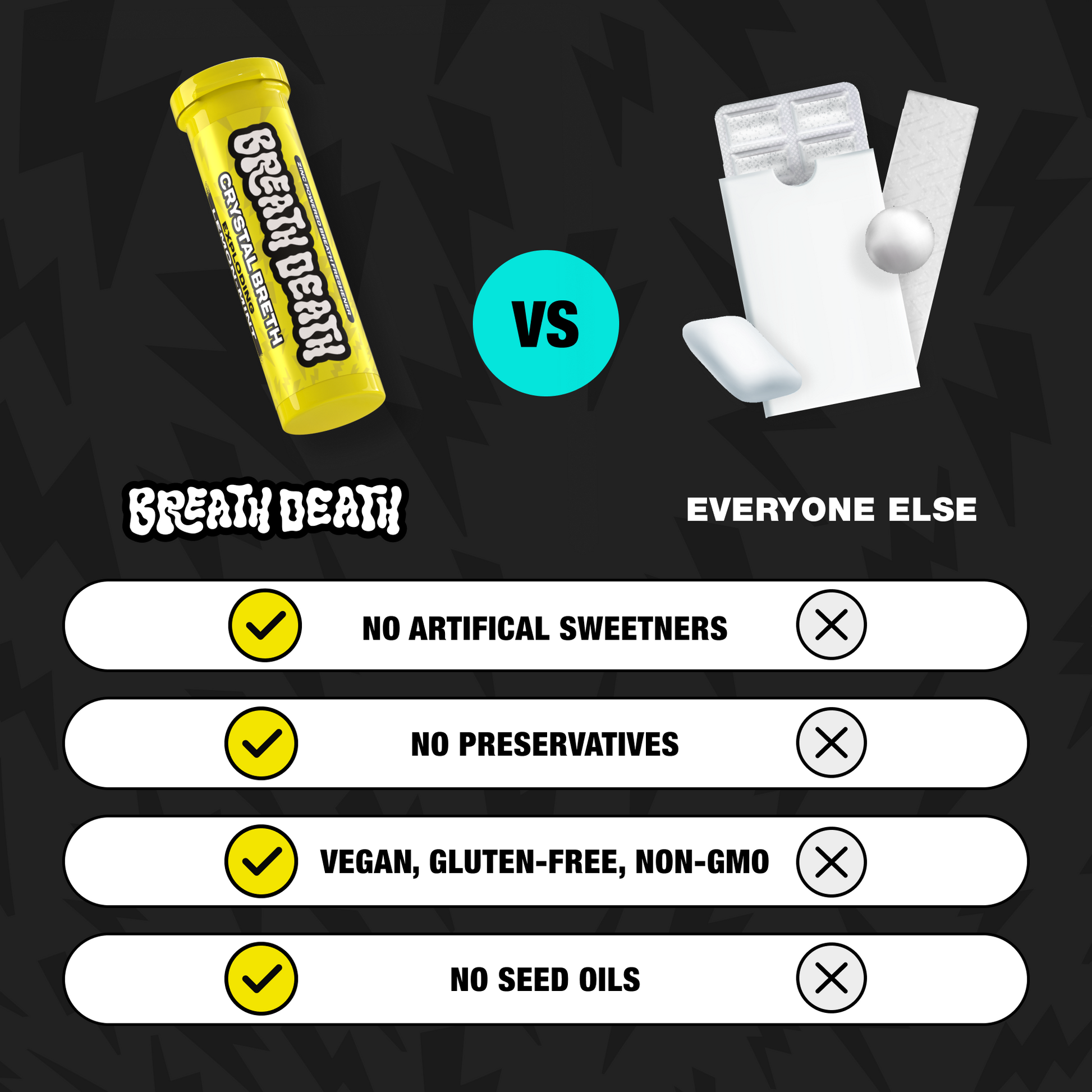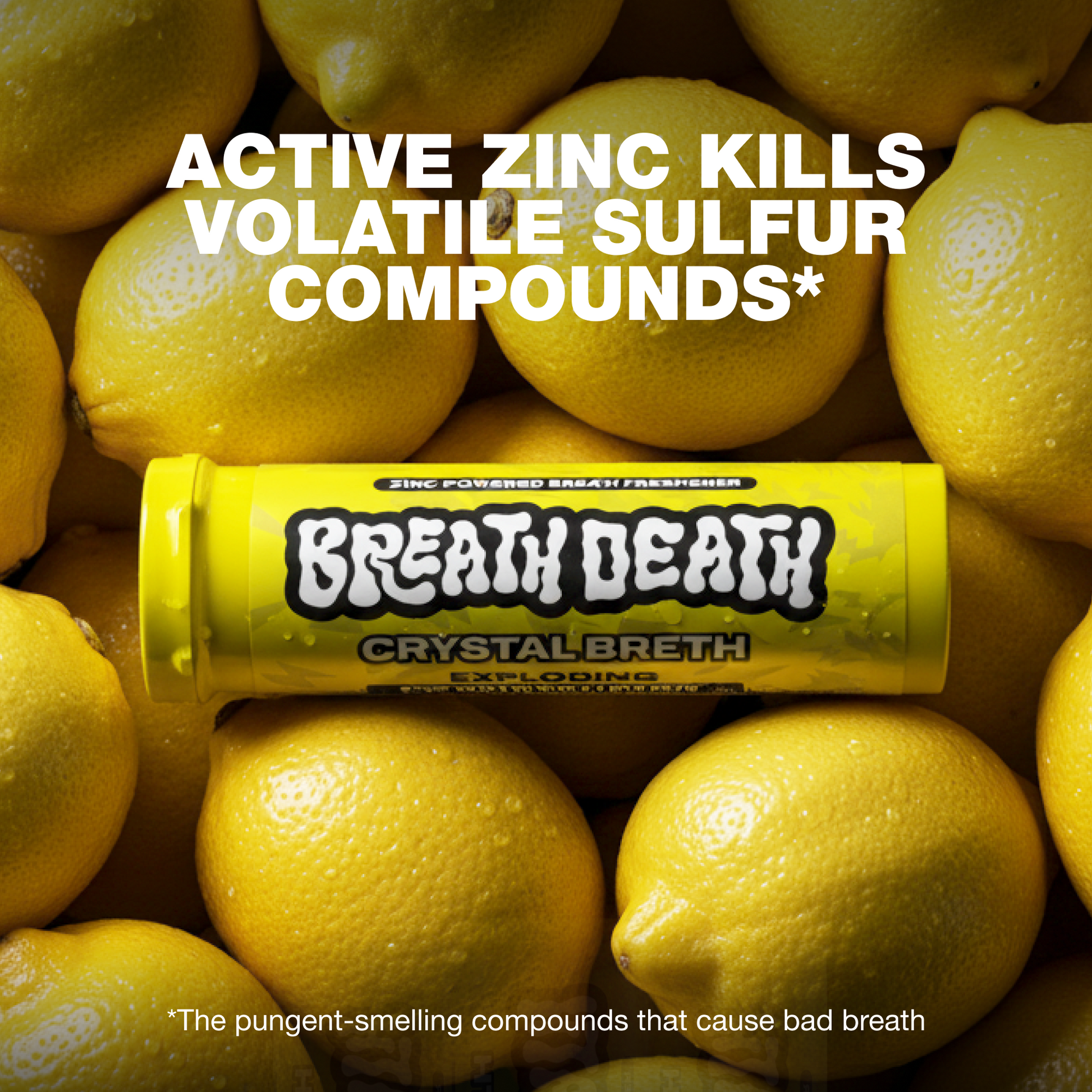 Crystal Breath's CO₂ powered mint crystals explode on contact, flooding your mouth with zinc-fueled destruction that doesn't just cover odor—it blasts it into the afterlife.