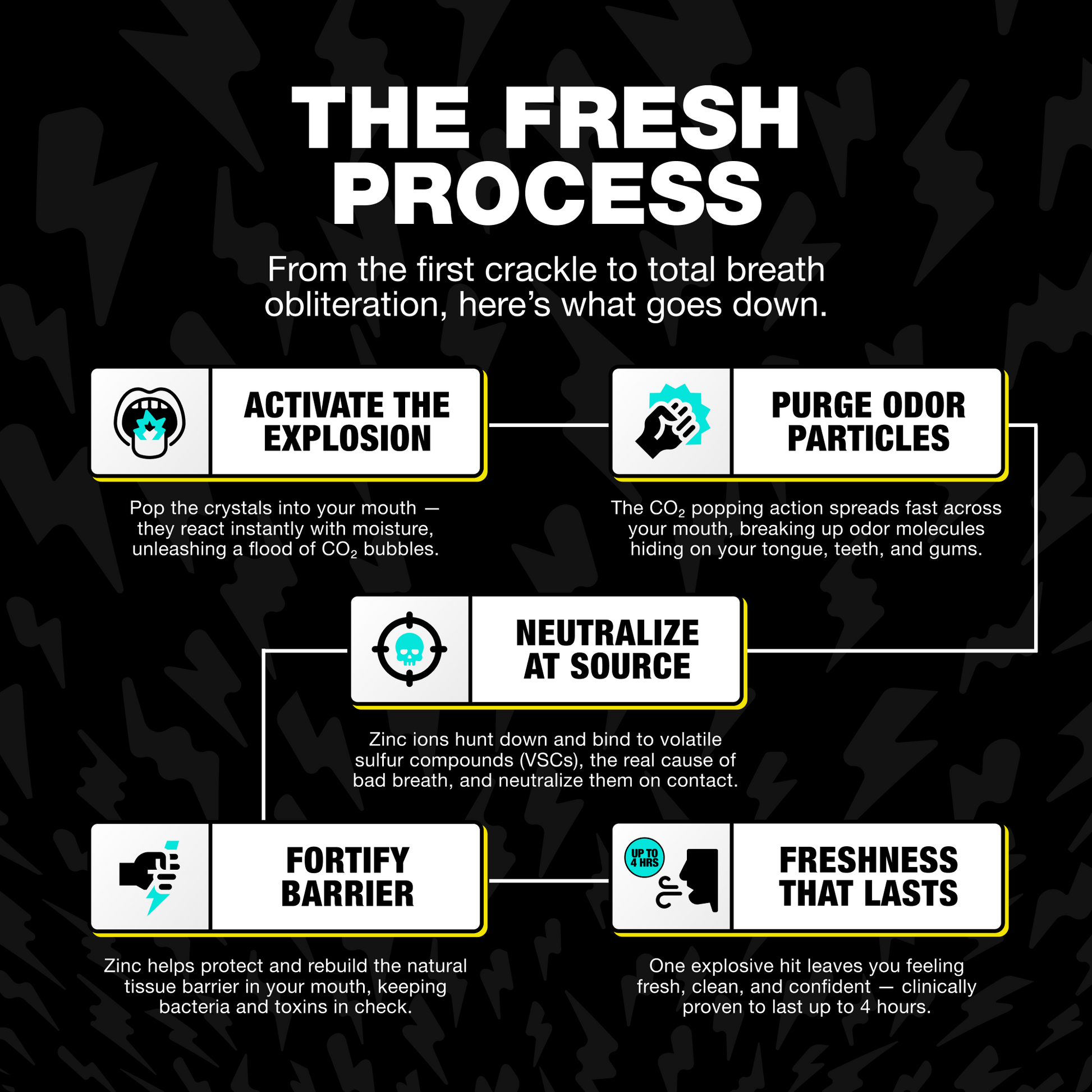 CO₂ bubbles blitz your mouth, blasting hidden funk from tongue to gums.